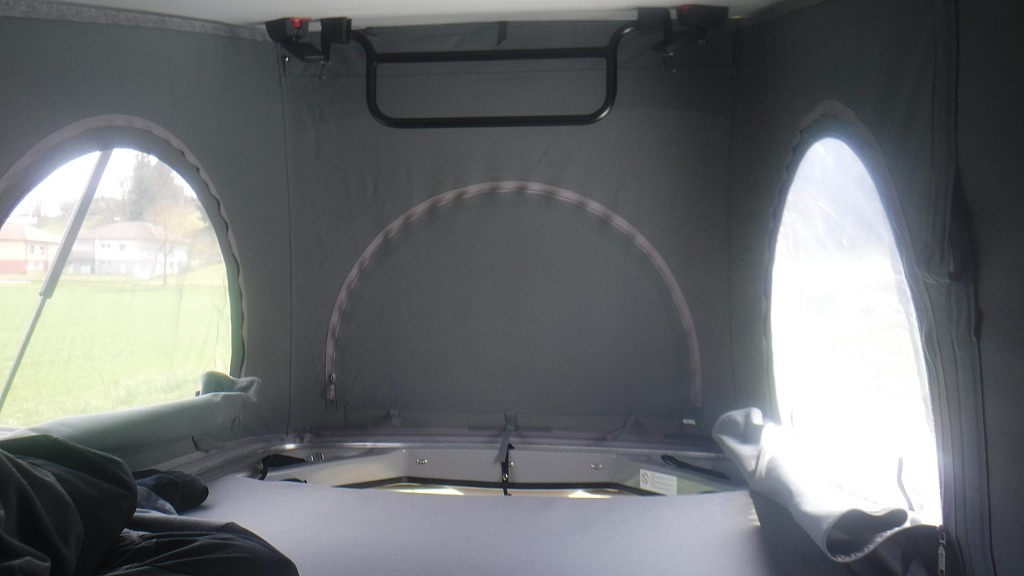 CROSSCAMP mit Ausstelldach, Markise, Drehsitze vorne, Kühlschrank und Gasherd.