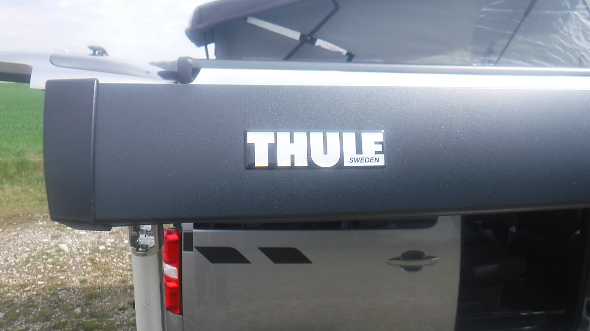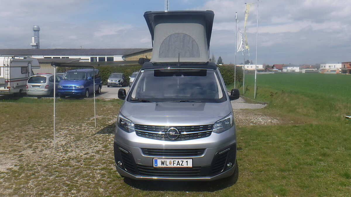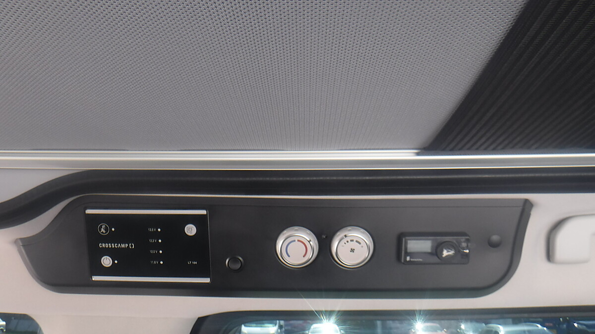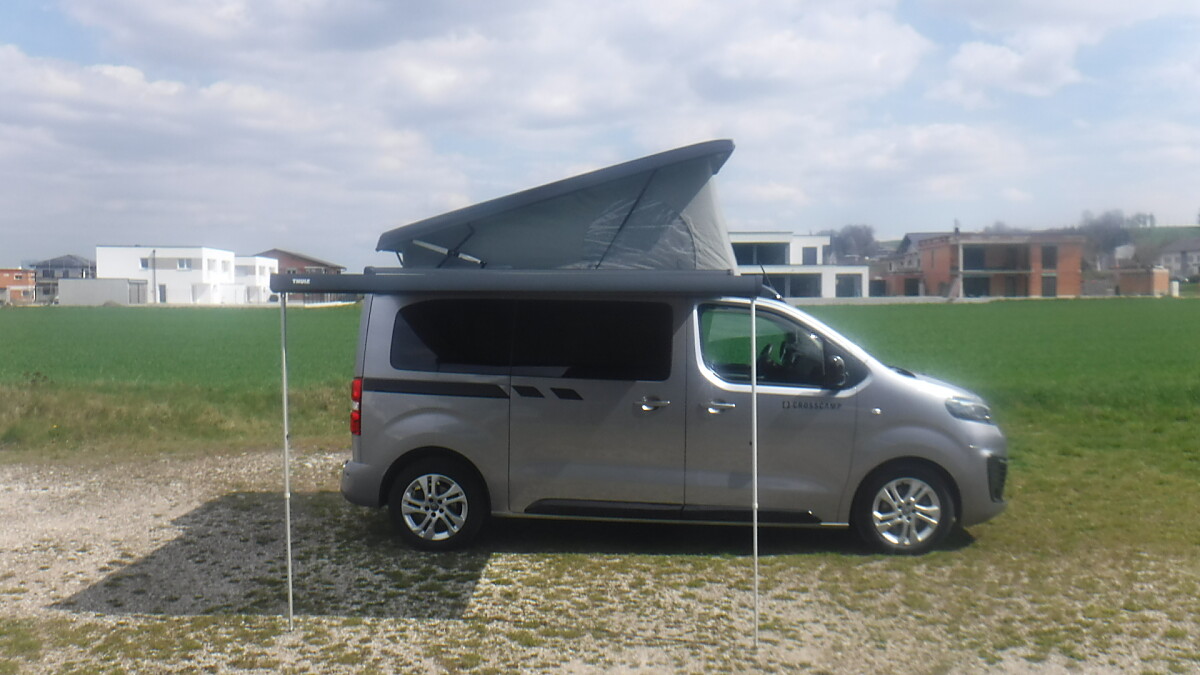 CROSSCAMP mit Ausstelldach, Markise, Drehsitze vorne, Kühlschrank und Gasherd.